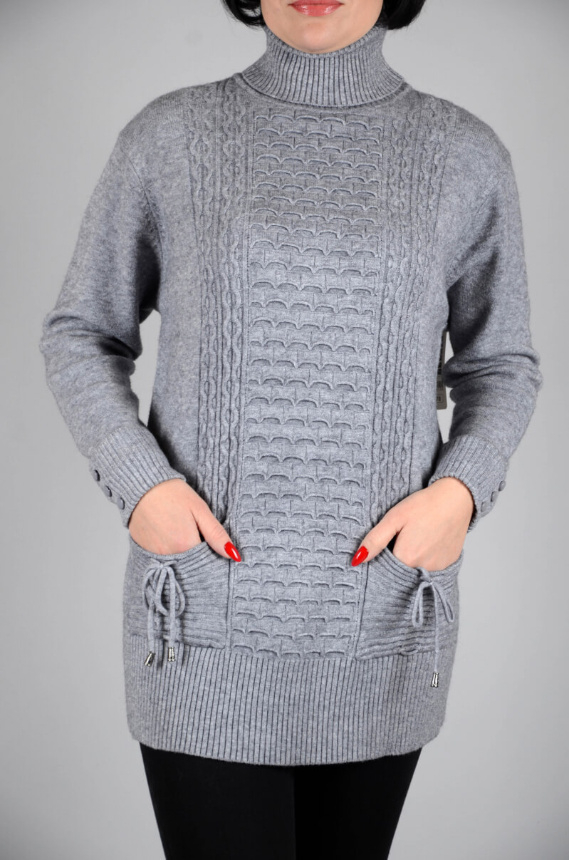 Тепла, затишна й універсальна туніка для холодного сезону. Виготовлена з м’якої в’язаної пряжі, що приємна до тіла та добре тримає форму. Має високий комір-гольф, фактурний візерунок спереду та зручні кишені з декоративними шнурками. Ідеально підходить як для щоденного носіння, так і для відпочинку вдома.